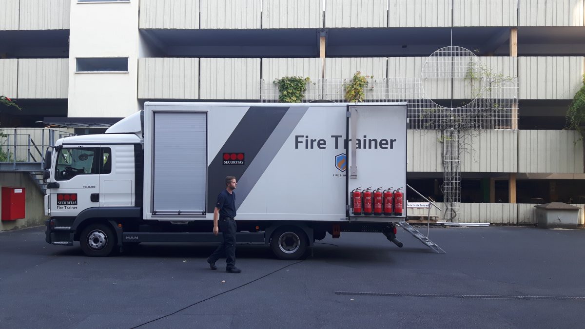 Um in einem Brandfall richtig zu reagieren und mit dem Feuerlöscher umzugehen, trainieren die Mitarbeiter des Leopoldina-Krankenhauses regelmäßig den Ernstfall. Neun Teilnehmer durften im “Fire Trainer”, einem Übungs-LKW der Werksfeuerwehr ZF, SECURITAS Fire Control + Service GmbH & Co. KG, das Löschen von verschiedenen Brandherden üben. Die Teilnehmer sammelten auch praktische Erfahrungen im Umgang mit einem Feuerwehrschlauch und das gezielte Löschen eines Entstehungsbrandes.